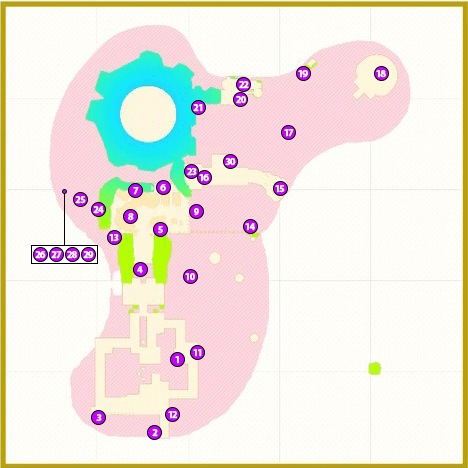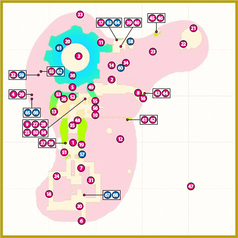 1. 타워 언덕 2. 마그마에 3. 오디세이호 옆의 언덕의 남쪽 측면 4. 광장 앞 올라서 냄비의 뒷면 6. 샵 뒷면 7. 재료 및 고지대의 틈새 8. 재료에 9. 돌출 발판 바로 10. 마그마에 11. 마그마 측면 벽의 틈새 12. 마그마에 13. 국물이있는 발판 아래에있는 구멍 마그마에 14. 문 앞의 무대에서 15. 보관소에의 길에서 동쪽 언덕 방향 높은 측면 하단 16. 치즈 바위 17. 마그마에 18. 토관 무대 19. 허수아비에 모자를 씌워 들어가는 문 앞의 무대 20. 파워문 39 문 옆 21. 파이어 머리 22. 파워문 39 문 23. 16 발판 24. 화산 동굴 입구 근처의 토관 25. 화산 동굴 앞의 옥수수 발판 26. 화산 동굴 첫 번째 폭포 27. 정상 루트 출발구 앞 28. 정상 루트를 등반 도중 29. 정상 루트를 등반 도중 30. 보관소로가는 길'옆의 언덕 |